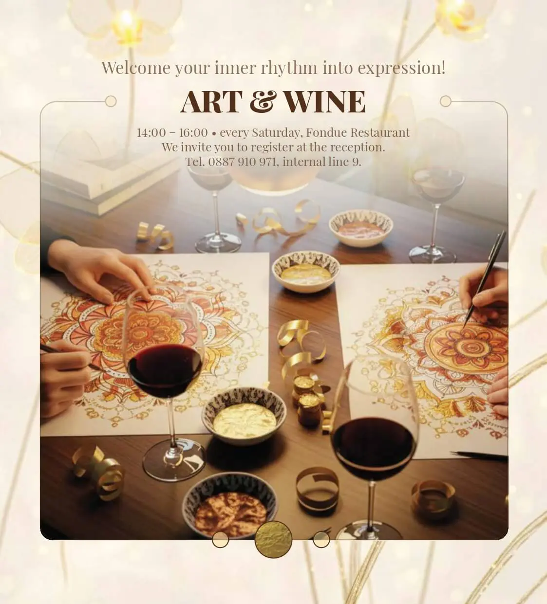 Whether you choose a refreshing massage, a warm sauna, or a glass of wine with a brush in hand during our art workshops, every moment is an invitation to reconnect with yourself. A variety of activities await you – from painting and wine to wellness therapies that will help you recharge and tune in to your inner rhythm.