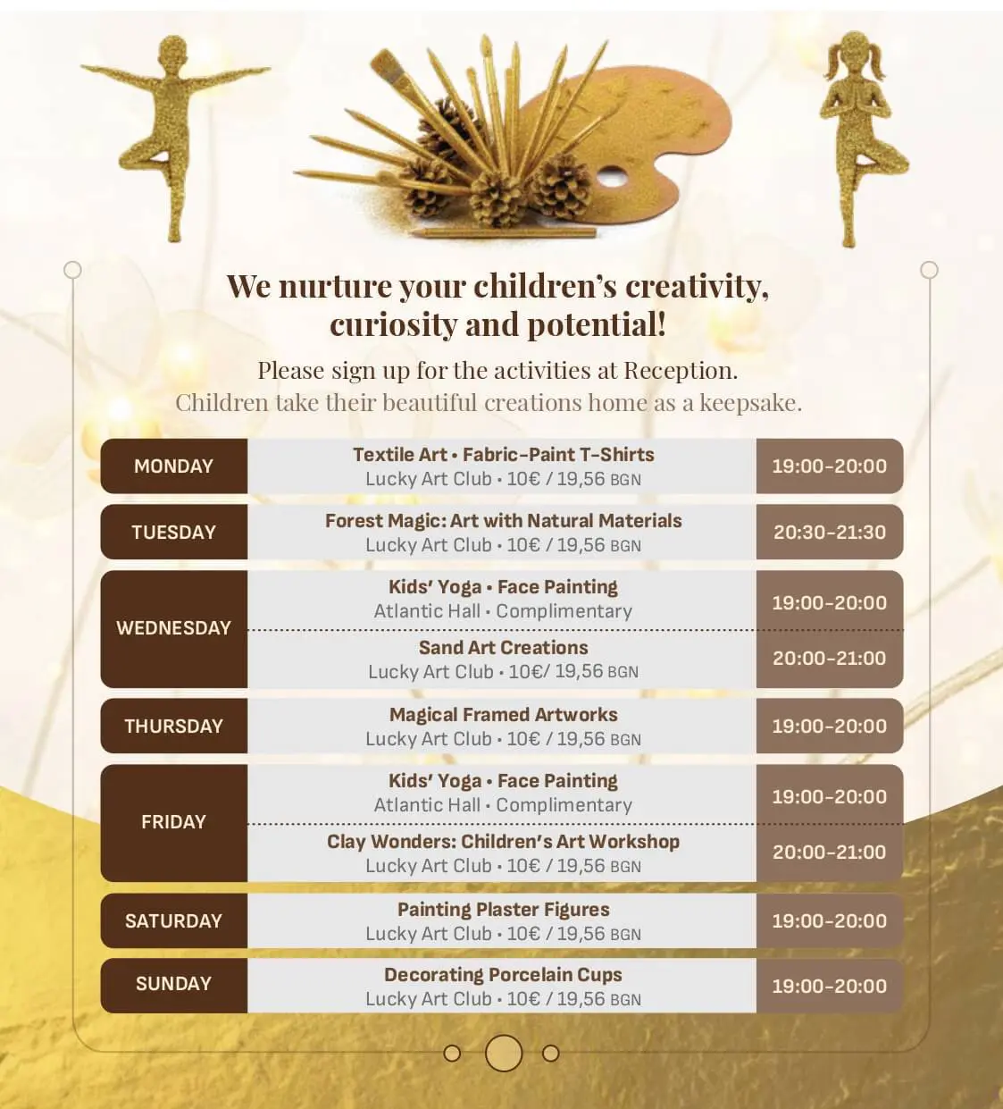 What it is: Exciting hands-on sessions with natural materials, sand art, clay modeling, fabric painting, and more.